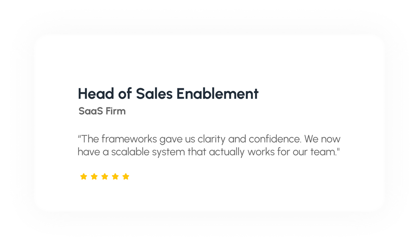 Many teams rely on ad-hoc processes and inconsistent onboarding. Without a unified, buyer-aligned sales engine, growth is unpredictable, ramp-up is slow, and performance varies across the team.